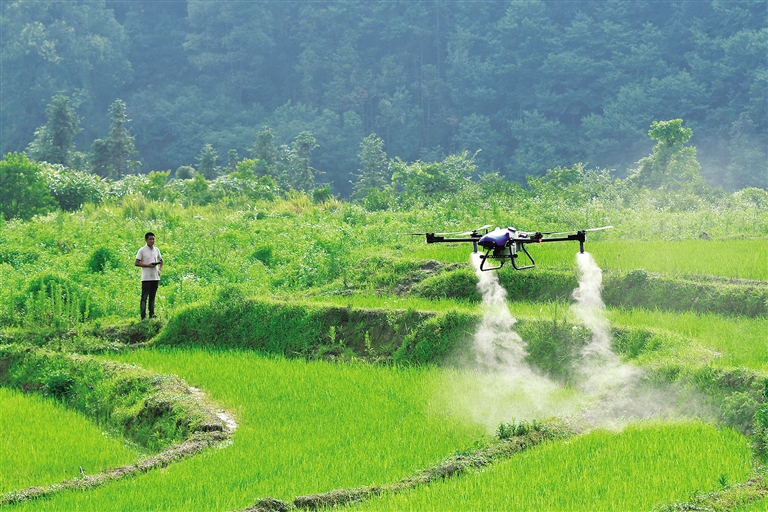 6月6日,在湖南省双峰县黄牛峰村,农技员操控植保无人机在田间进行病虫害防治作业。当日是芒种节气,各地农民抢农时、忙耕作,田间地头呈现一派忙碌景象。新华社发