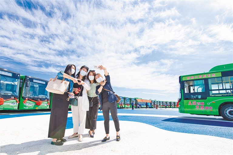 游客在呼和浩特市敕勒川草原广场与新开通的公交旅游专线车辆合影留念。本次开通的专线公交汽车均为纯电动新能源车型,共计5条旅游专线。 本报记者 怀特乌勒斯 摄