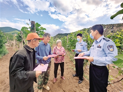 近日,赤峰市喀喇沁旗公安局民警深入辖区田间地头,通过“拉家常”的方式宣讲反诈知识,现场手把手教村民安装使用“国家反诈中心”APP。本报记者 陈春艳 摄