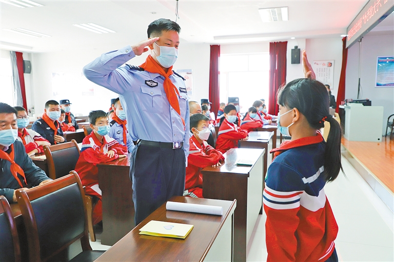 近日,呼和浩特市公安局赛罕区分局组织民警走进辖区小学开展“少年儿童心向党”主题党日活动。民警为20名留守儿童送去书包、文具等。小朋友为民警系上准备好的红领巾,并敬队礼致谢。本报记者 陈春艳 摄