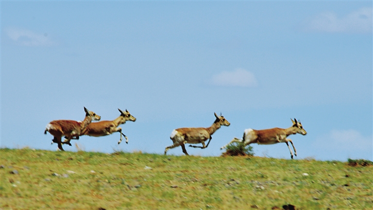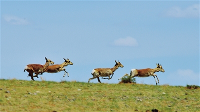 6月8日,一群膘肥体壮、身体矫健的野生黄羊奔跑在达茂旗边境草原上。近年来,随着生态环境持续改善,人们的野生动物保护意识不断增强,非法狩猎得到有效遏制,达茂旗的野生动物种群和数量得到恢复性增长,黄羊、蒙古野驴、金雕等珍稀野生动物时常可见。秦文秀 摄