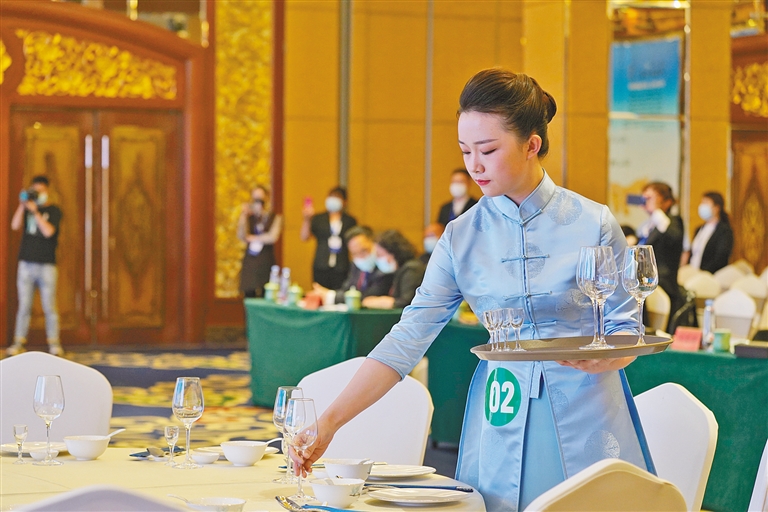 图为选手在比赛中。“内蒙古旅游饭店服务技能大赛”旨在提振我区旅游业,在这次比赛中,一批旅游服务新星脱颖而出。本报记者 冯雪玉 摄
