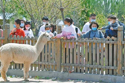 图为游客在呼和浩特市大青山野生动物园游玩。随着气候的转暖,越来越多的人走出家门,亲近自然。