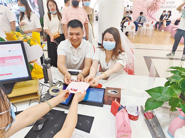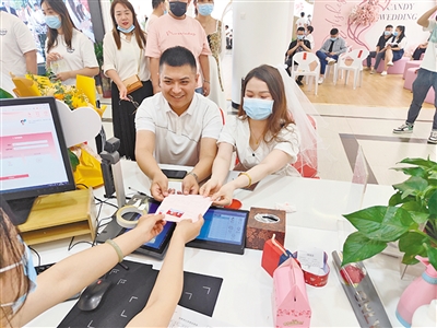 当天,婚姻登记处的爱情餐吧推出了“全城最甜蜜的蛋糕”“以爱为名咖啡”“爱相随情侣奶茶”等饮食品,并为排队等候登记的新人免费提供。记者看到,众多新人手持婚姻登记大厅提供的打卡地图,来到结婚颁证厅宣誓,然后来到爱巢区参加一对一婚前教育小课堂。婚姻博物馆、婚俗展厅、美术作品展和非遗作品展也吸引了不少新人驻足参观。一对新人在婚姻博物馆看到各个年代结婚证展示,激动地说:“我爸爸妈妈的结婚证就是这样的!”新郎李先生说:“这个公园里的婚姻登记处真是改变了我们对办事机关的传统认识,这里更像一个开放式的婚姻文化馆,让大家了解婚姻的历史传承,才会更加珍惜自己的婚姻生活。”