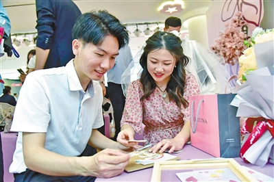 在婚姻登记大厅的文创区,手作活动吸引了不少情侣前来参观体验,一对刚领到结婚证的新婚夫妻在老师的指导下制作了一对情侣银戒,并认真地嵌刻上两人姓氏的首字母,新娘幸福地说:“我们能在登记结婚的现场制作这样一对银戒,非常珍贵,我们一定好好保存。”