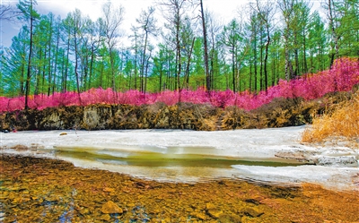 内蒙古好森沟国家森林公园,夏日红花绿树与冰河相映成趣。文/图 于振海