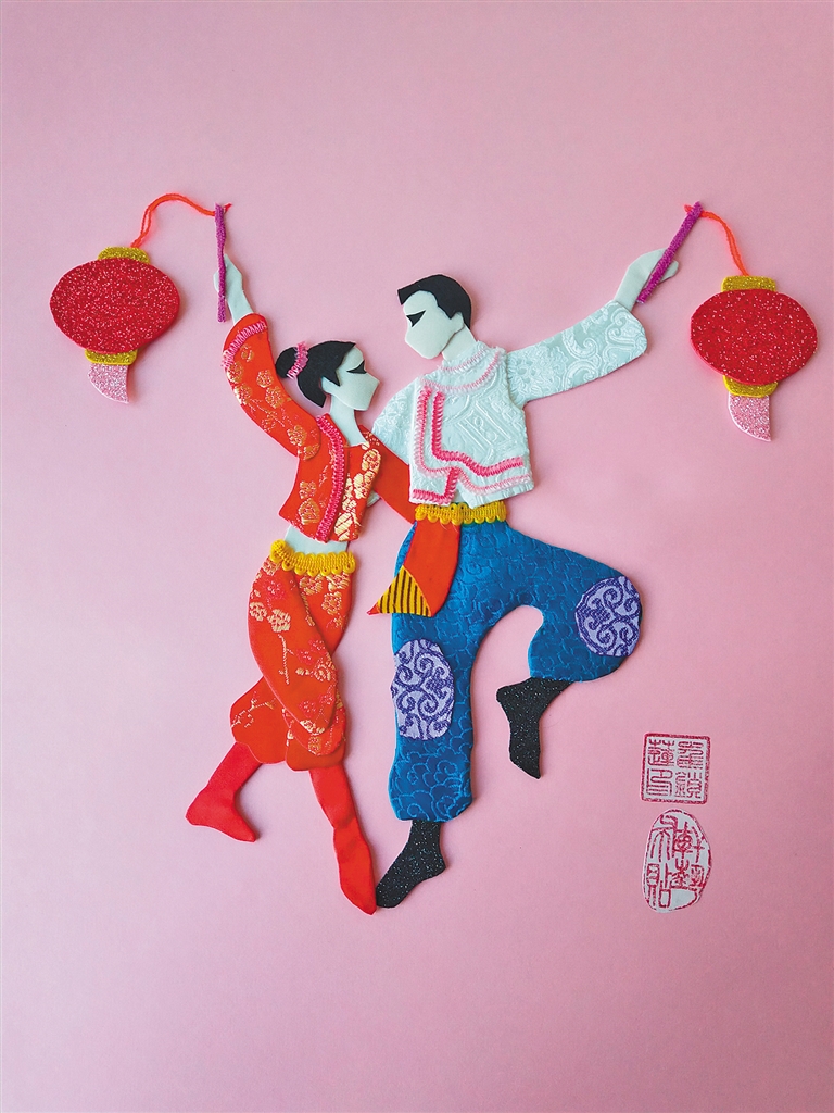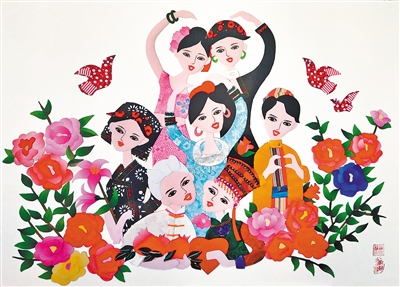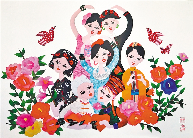 崔锁莲说,最近,她和儿子孙羽又构思制作了布贴画《民族团结一家亲》。画中,汉族、蒙古族、维吾尔族、傣族、黎族、布依族、侗族等7位不同民族的女子紧紧依偎在怒放的月季、百合花丛中,乐享和谐美好生活、赞美伟大祖国、歌颂新时代……