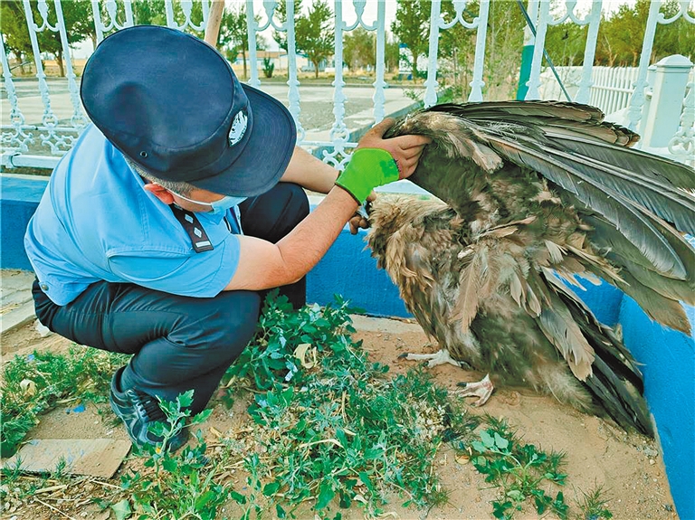 初夏的一天,乌拉特中旗巴音乌兰边境派出所及时救助了一只国家一级保护动物秃鹫。