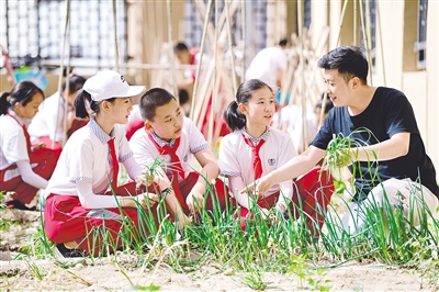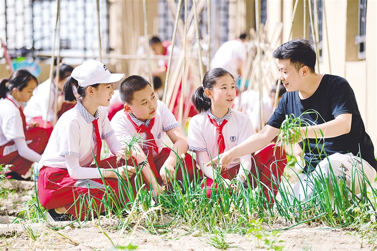6月14日,呼和浩特市锡林南路小学分校的学生在劳动试验田中开展劳动种植实践活动。为进一步落实“双减”政策,该校开设了《种植农作物》课程,引导学生主动、积极投入到劳动探究实践中,实现以劳树德、增智、健体、育美的目的。本报记者 王磊 摄