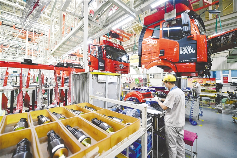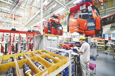 6月15日,工人在位于吉林长春的一汽解放总装车间内装配车辆。近来,在一汽解放集团股份有限公司,生产按下“加速键”,车间内一片忙碌景象。 新华社记者 许畅 摄