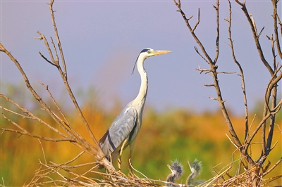 磴口县奈伦湖畔,苍鹭喂食幼鸟后,观察周边是否异常。