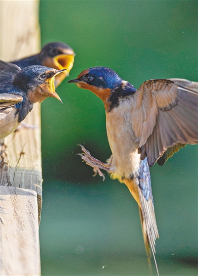 开鲁县开鲁镇,燕子喂食幼鸟。文/图 张宝玉