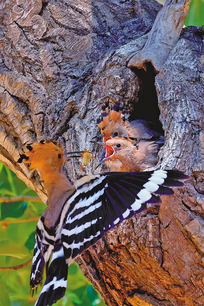 赤峰市元宝山区平庄镇,戴胜捉回昆虫,幼鸟嗷嗷待哺。 文/图 张国清