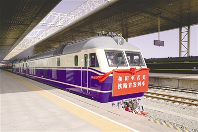 6月16日,和若铁路首趟列车缓缓驶出新疆和田火车站。6月16日,满载乘客的5818次列车从新疆和田站驶出,和若铁路开通运营。和若铁路与南疆铁路、格库铁路构成一条全长2712公里的环塔克拉玛干沙漠铁路线。自此,世界首条环沙漠铁路线建成。和若铁路是国家重点铁路建设项目,地处世界第二大流动性沙漠——塔克拉玛干沙漠南缘,西起新疆和田市,东至巴音郭楞蒙古自治州若羌县,全长825公里,设计时速120公里,为国家Ⅰ级单线铁路。和若铁路的建成通车结束了且末、民丰等5个县和新疆生产建设兵团3个团场不通火车的历史,将进一步完善新疆铁路网结构,极大便利沿线各族群众出行和货物运输,带动沿线资源开发。新华社记者 丁磊 摄