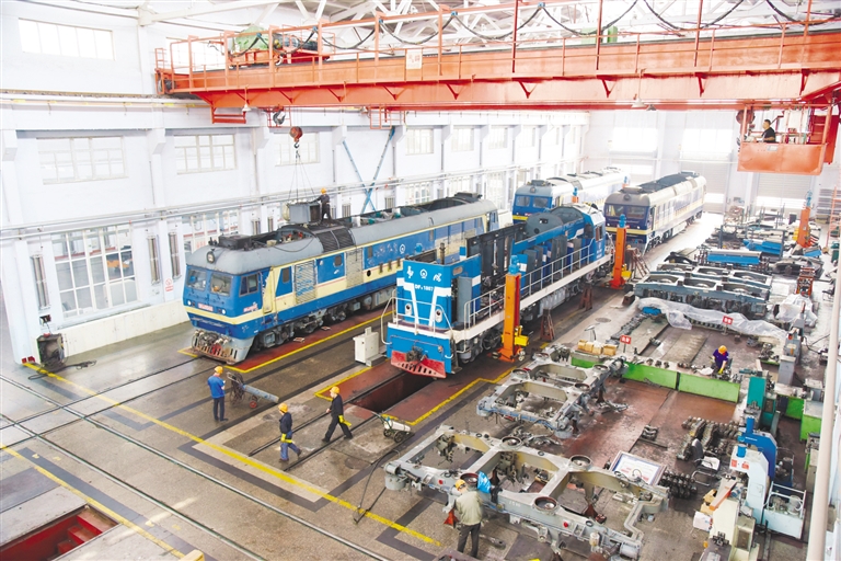 6月17日,中铁呼和浩特局呼和浩特机务段集宁检修车间职工组装中修机车。据了解,针对近期集二线货运上量、唐包线万吨列车开行对数增加等情况,呼和浩特机务段合理安排机车检修计划,提升机车检修质量,确保电煤等重点物资应运尽运,保障中欧班列稳定运行。本报记者 马骏驰 摄