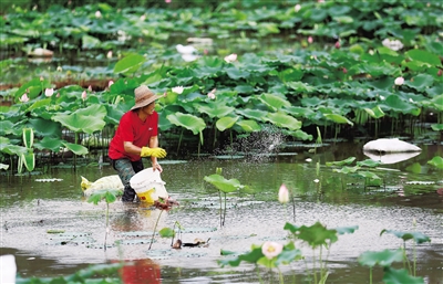 6月20日,在湖南省资兴市唐洞街道香花村,农民在荷田里施肥。夏至将至,湖南省资兴市唐洞街道香花村农民抢抓农时,忙着在荷田里开展施肥等夏管作业,田间地头一派忙碌景象。 新华社发