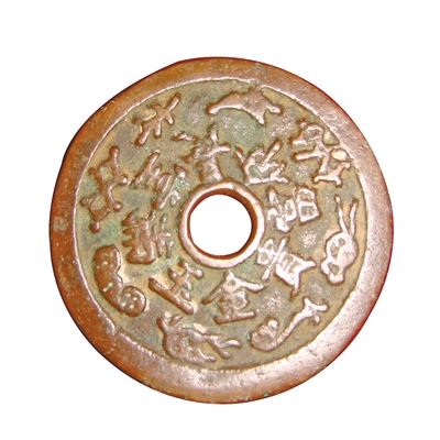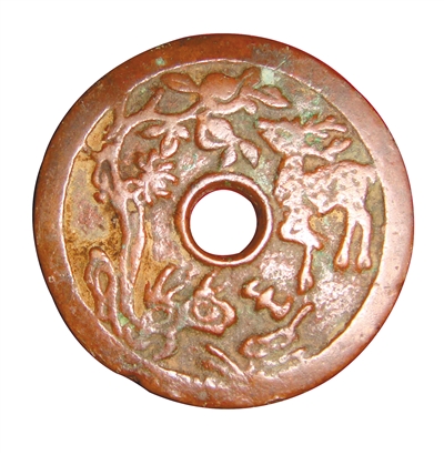 父亲拆开毽子底坐已经腐烂的布条,我眼前一亮,当年扎毽子时用的是两枚铜钱。小时候,我们村东有条大河,枯水季节河床露出来时,我和小伙伴经常到河滩上挖中间有孔的铜钱扎毽子,这两枚铜钱就是那时候我在河滩上挖出来的。一枚残损,另一枚中间不是一般铜钱那种方孔,而是圆形,纹饰精美。铜钱正面镌“金玉满堂长命富贵”,字迹深峻有立体感,背面为吉祥图案,圆孔左侧有一株桃树,枝叶繁茂,树下有一蟢子;右侧有一鹿、一蝙蝠,地上有灵芝,图案精美、传神。铜钱上的文字和图案,表现寓意的手法通常有谐音和象征两种,比如蝙蝠代表“福”,仙鹿代表“禄”,蟢子代表“喜”,桃树、灵芝都象征“寿”,这两枚铜钱上的寓意是“福禄寿喜”。经钱币专家鉴定,此币为清代所铸吉庆花钱,非流通货币。