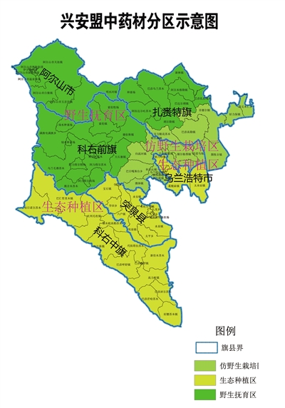 根据兴安盟大兴安岭向草原过渡地带地形分布和兴安盟林草生态建设划分的北部大兴安岭生态屏障区、中部浅山丘陵生态修复区、南部科尔沁沙地锁边区和各级各类自然保护地“三区一地”保护格局,将兴安盟林下中药材种植划分为三个区域。