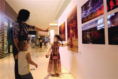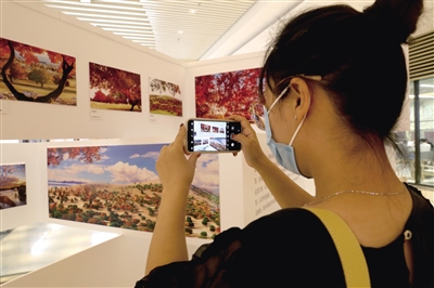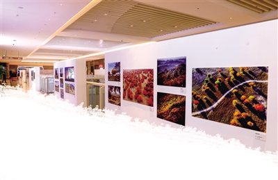 走进展厅,首先映入眼帘的是一幅气势恢宏的航拍五角枫美景照片,火红的五角枫下牛羊成群、骏马奔驰。《罕山黑鹳》《候鸟家园图牧吉》《黄羊驻兴安》等作品,将镜头对准兴安盟绿色生态,让观众领略到了兴安盟独特的自然生态系统和丰富的生物多样性。