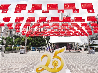大街小巷国旗、区旗飘扬,中环码头行人天桥挂满大红灯笼,维港海面渔船浩荡巡游,新界居民架起传统大型花牌,“我和我的祖国,一刻也不能分割”的歌声在维园荡漾……回归祖国25周年纪念日来临之际,香港到处洋溢着喜庆氛围。