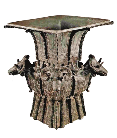 点评:四羊方尊造型雄奇,设计巧妙,花纹精美,线条刚劲光洁。采用圆雕与浮雕相结合的装饰手法,将四羊与器身巧妙结合为一体,整个器物用块范法浇铸,一气呵成,展示了高超的铸造水平,被史学界称为“臻于极致的青铜典范”,位列十大传世国宝之一。