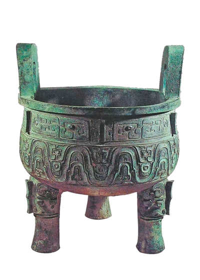 在周代,有所谓“天子九鼎,诸侯七鼎,卿大夫五鼎,元士三鼎”等使用数量的规定。随着这种等级、身份、地位标志的逐渐演化,鼎逐渐成为权力的象征。文中这件鼎是西周晚期(孝王时期)一个叫克的大贵族为纪念祖父的丰功伟绩而铸造的,故命名为“大克鼎”。鼎口有大型双立耳,口沿微敛,方唇宽沿,腹略鼓而垂,呈敛口侈腹。鼎足着地点比上端略宽大,重心略向外偏,是典型的周鼎器形。颈部饰有三组对称的变形饕餮纹,相接处有突出的棱脊,腹部饰一条两方连续的大窃曲纹(即波曲纹),环绕全器一周。鼎足上部另饰有突出的饕餮形象三组。鼎耳饰有相对的龙纹。