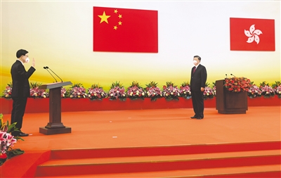 习近平指出,中华民族伟大复兴已经进入不可逆转的历史进程。推进“一国两制”在香港的成功实践是这一历史进程的重要组成部分。我们坚信,有伟大祖国的坚定支持,有“一国两制”方针的坚实保障,在实现我国第二个百年奋斗目标的新征程上,香港一定能够创造更大辉煌,一定能够同祖国人民一道共享中华民族伟大复兴的荣光。(讲话全文另发)