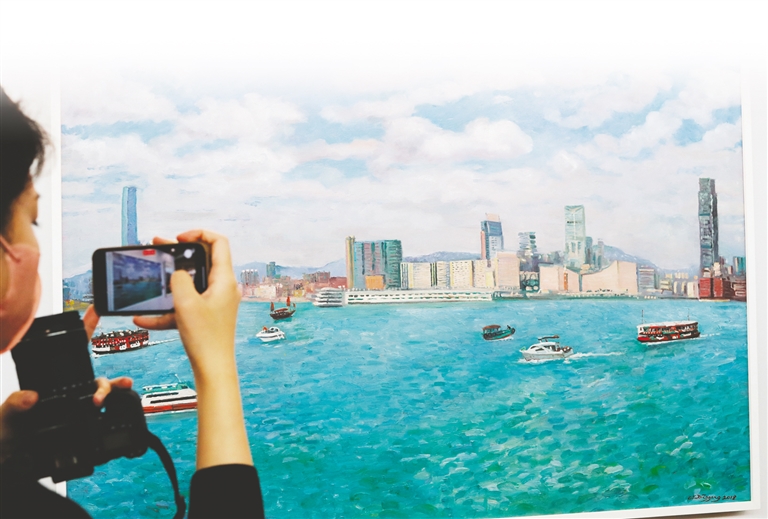 此外,表现粤港澳大湾区建设成就的港珠澳大桥、狮子山下传统与现代结合的建筑、香港城市的美丽风景、朵朵绽放的紫荆花……包含这些与港人生活密切相关元素的画作也是本次展览的一大亮点。