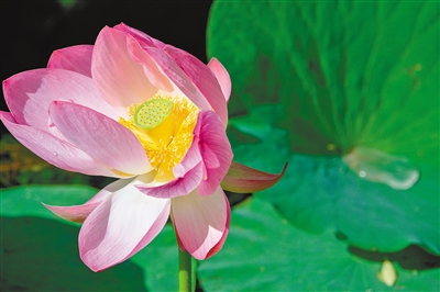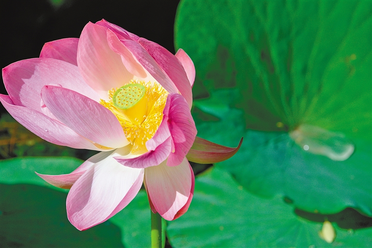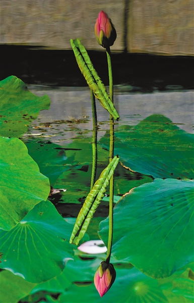 夏日烟雨中,湖畔上的荷花摇曳生姿、次第渐开。行人停下脚步,为她的美丽而驻留;绿色的夏,因她更娇,因她更闪亮。