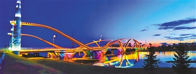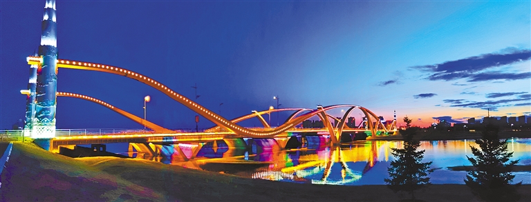 呼伦贝尔市海拉尔区天骄大桥,霓虹闪烁,流光溢彩。文/图 宝音