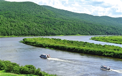 7月17日,游客乘船游览呼伦贝尔市额尔古纳河两岸风光。据了解,依托口岸优势,额尔古纳市精心打造跨境游,丰富旅游产品结构。如今,额尔古纳市界河游已成为内蒙古东部精品旅游线路上一张亮丽的名片。 本报记者 王磊 摄