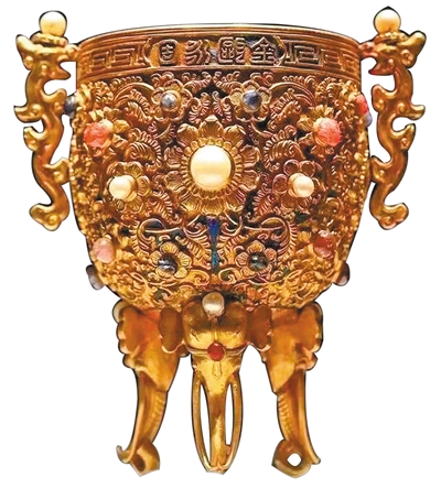 渊源:乾隆年间,清宫造办处制造了各式酒杯,其中不乏龙耳作品,但这种以象鼻为足的作品却很少。据现有档案、文献记载,乾隆共制作了4件金瓯永固杯,分别是乾隆四年1件、乾隆五年2件、嘉庆二年1件。乾隆四年(1739),乾隆谕旨造办处配一金杯,名为“金瓯永固”,并对造型、纹样及所嵌珠宝以及点翠作了明确指示。一年后,乾隆又下旨,要求造办处再做2件金瓯永固杯,并提出了新的要求:耳子夔龙上各安大珠子一颗,两面每面安珠子5颗,中间一颗大些、花头要圆的。嘉庆二年(1797),有只金瓯永固杯受损,乾隆要求重新制作,便是文中这只杯,现收藏于北京故宫博物院。另外3只乾隆年间制的金瓯永固杯,1只金质的,现收藏于台北故宫博物院,1只金质、1只铜鎏金质在国外。