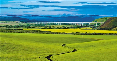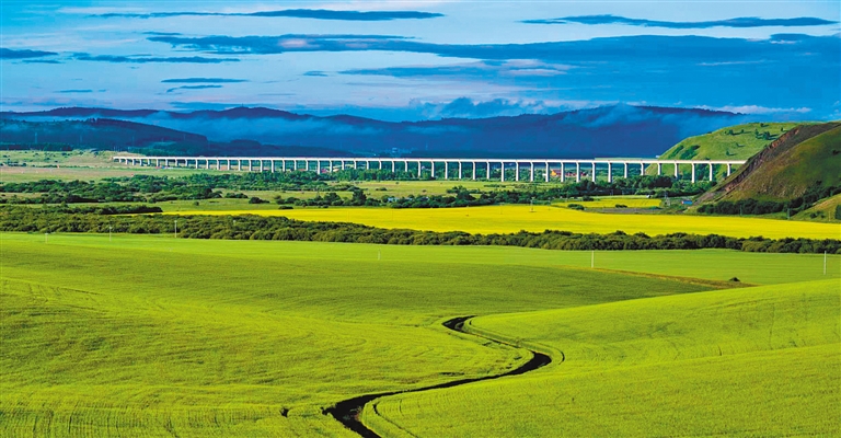 新巴尔虎左旗罕达盖苏木,麦浪滚滚,油菜花金黄,大桥连通南北,气势恢宏。文/图 全东旭