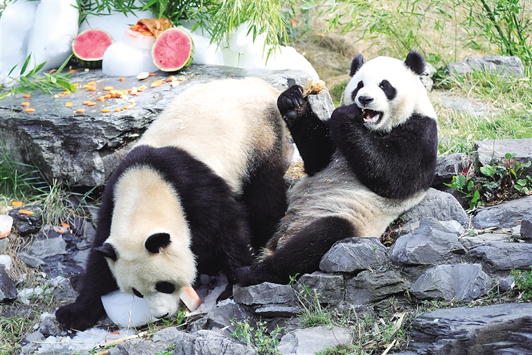8月6日,在比利时布吕热莱特的天堂动物园,大熊猫“宝弟”(左)、“宝妹”享用“生日大餐”。当天,比利时埃诺省布吕热莱特的天堂动物园举行活动,为在这里出生的大熊猫“宝弟”和“宝妹”庆祝三岁生日。2019年8月8日,中国旅比大熊猫“好好”产下龙凤胎“宝弟”和“宝妹”。新华社记者 郑焕松 摄