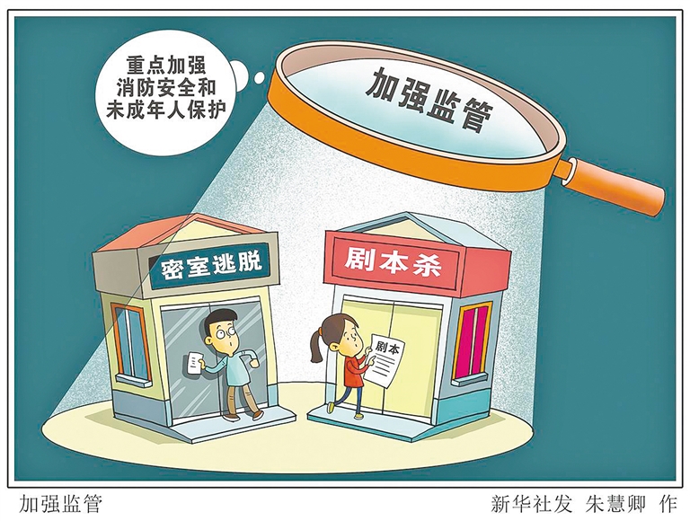 随着暑期到来,作为当下年轻人的社交新宠,密室逃脱、剧本杀等娱乐休闲消费趋火。与此同时,消防安全、服务质量等问题也不断引发关注。不久前,文化和旅游部等五部门联合发布《关于加强剧本娱乐经营场所管理的通知》,强化对密室逃脱、剧本杀等近年来快速发展的剧本娱乐经营场所新业态的监管。新华社发 朱慧卿 作