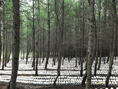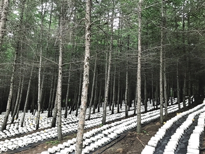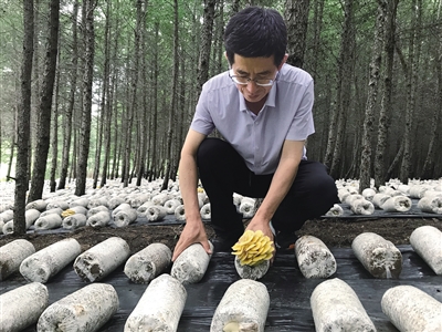7月下旬,静谧的赤峰市喀喇沁旗马鞍山林场一片阴凉。林场片区内、河南街道黄家窝铺村的一块林地里,高高的落叶松下,飘落的柔软松针已化作“护花使者”铺满林间,上面长出了大大小小的玉黄菇。这是张文忠租种的15亩林地,今年开始种植食用菌。自此,他一身兼两职,不仅是护林员,还是种植户。