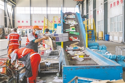 8月16日,呼和浩特市新城区生活垃圾分拣中心,工人们正在分拣打包垃圾纸片。据了解,该中心集可回收垃圾精细分拣打包、大件垃圾拆卸分解、厨余垃圾发酵堆肥、有害垃圾分类暂存等功能于一体,可日处理垃圾300吨,实现了生活垃圾由粗放式管理到精细化管理的升级,达到了“减量化、资源化、无害化”的目的。