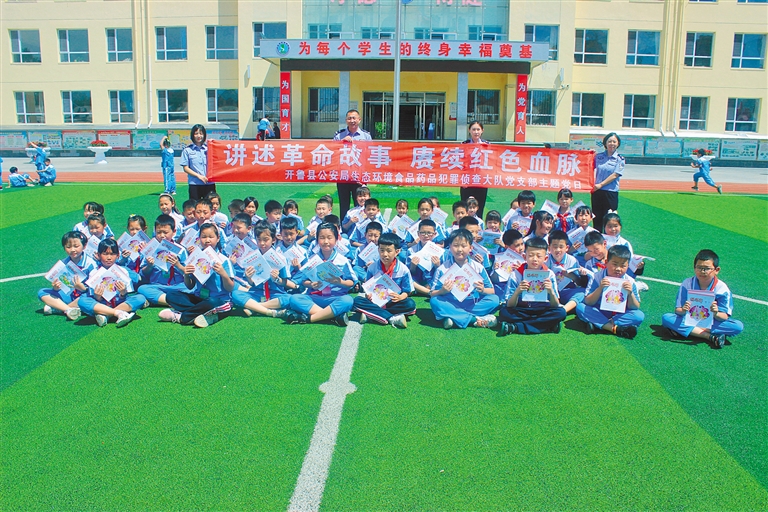 近日,通辽市开鲁县公安局环食药大队党支部与县民主小学党支部联合开展“讲述革命故事 庚续红色血脉”主题党日活动,民警通过为小学生讲述革命故事,教育引导孩子们传承革命精神,爱党爱国,好好学习。图为学生们展示民警赠送的学习文具。本报记者 陈春艳 摄