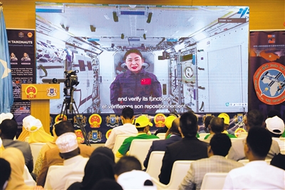 这是9月6日在索马里首都摩加迪沙拍摄的“天宫对话”活动索马里分会场。来自埃塞俄比亚、埃及等非洲8国的青少年6日通过网络视频与正在中国空间站执行任务的神舟十四号航天员进行“天宫对话”活动。当天活动的主会场设在位于埃塞俄比亚首都亚的斯亚贝巴的非洲联盟(非盟)委员会总部,并在阿尔及利亚、埃及、埃塞俄比亚、纳米比亚、尼日利亚、塞内加尔、索马里和南非共8个国家设立分会场,来自中非各界近千人出席。