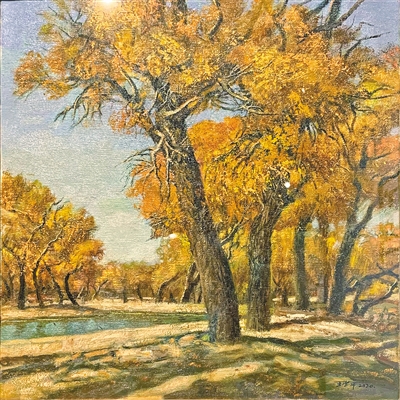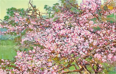 王治平的油画《胡杨神树》,深入细致地描绘了额济纳胡杨树的独特风采,礼赞了千年不朽的胡杨精神。作者的另一幅作品《桃花依旧笑春风》则描绘了呼和浩特桃花盛开的情景,画面桃花怒放,春意盎然,寄寓了画家美好的愿景。侯明的油画《后山村落》浓墨重彩地表现了后山地区新农村的景象。张鹏的油画《雪霁》忠实地再现了北疆雪后初阳的温暖情景。孙与平的油画《茫茫鄂伦春》则表现了雪后鄂伦春的独特风情。马志有的水彩画《驯鹿》通过独特的内容,写实的语言,表现了冬季呼伦贝尔的独特景致。李玉璋的油画《秋色》通过厚重的色彩表现了阴山山脉大青山麓秋天的景色。崔雪冬的油画《云中古城》以近乎抽象的画面,表现了云中古城的历史遗韵。张项军的油画《恩和小镇》采用大刀阔斧的笔触,表现了恩和小镇的独特风姿。谷芳的油画《夏》表现了盛夏时节阴山南麓农田的一派生机。而文胜的油画《武川风景》则通过浓重的色彩表现了夏日后山地区的景致。刘微微的油画《白音敖包的百年云杉系列二》借鉴印象派的绘画语言,表现了百年云杉的风采。郭敏的油画《蓝旗秋韵》通过明亮的色彩对比,表现了“秋”的意韵。塞南的水彩画《黑城遗址》利用统一的色调,单纯的色彩表现了茫茫戈壁上西夏古城的残垣断壁,引人遐想。柳迪的水彩画《山长水阔》采用四联画的形式,表现了草原上山峦与河流的辽阔与壮观。