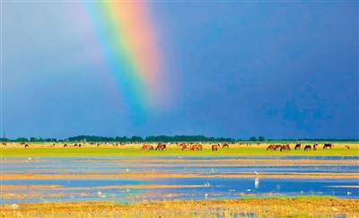 扎赉特旗图牧吉镇,树木苍翠,牛马悠然,长虹起于树杪,直挂云天,气势磅礴。 文/图 梁斌