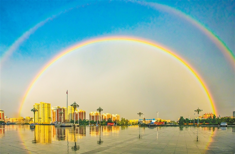 扎赉特旗音德尔镇,夕阳乍现,楼宇金辉,双虹新落,宛如幻境。