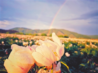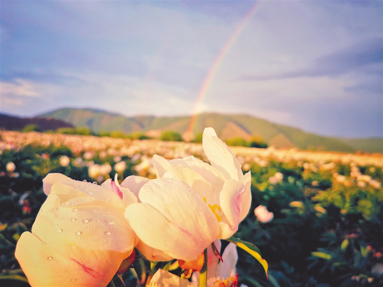 牙克石市塔尔气镇,芍药花海,含羞带露,瑰丽长虹直插云霄,美景如画。文/图 任凤杰