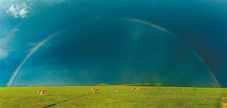 阿鲁科尔沁旗坤都镇,雨后初晴,彩虹新挂,彤云渐去,碧草青青,肥牛悠然,唯美静谧。 文/图 刘文忠