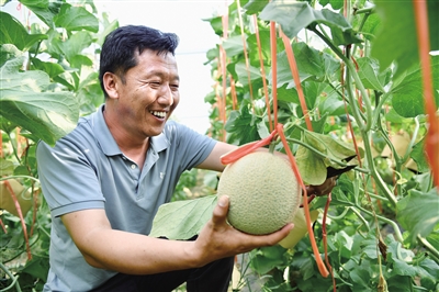近日,呼和浩特赛音农业种植专业合作社负责人李国庆正在采摘网纹瓜。据了解,该合作社带动帮扶赛音不浪村、根堡村等村46户农户种植了200亩网纹瓜,每亩纯收入达15000元以上。 本报记者 孟和朝鲁 摄