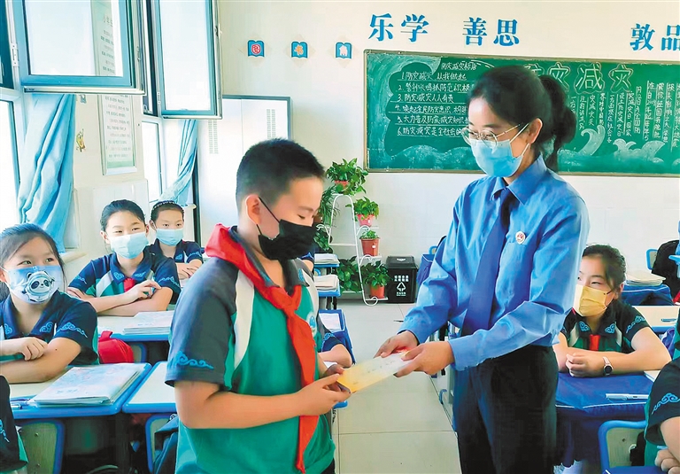 近日,呼和浩特铁路运输检察院“女检团”走进赛罕区民族小学,给同学们上了一节生动易懂的未成年人权益保护公开课。图为检察官为小学生赠送法治宣传书籍。