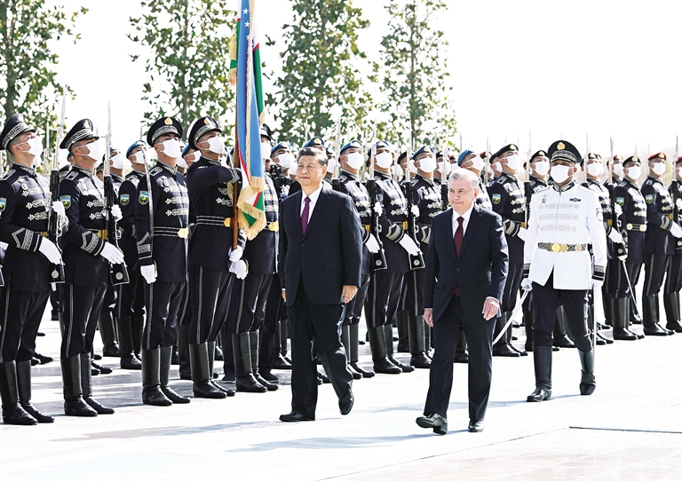 米尔济约耶夫为习近平举行隆重欢迎仪式。两国元首共同登上检阅台,军乐团奏中乌两国国歌。习近平在米尔济约耶夫陪同下检阅仪仗队。两国元首分别介绍各自陪同人员,并共同观看分列式。