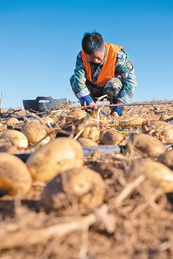金秋时节,在乌兰察布市四子王旗马铃薯种植基地,个儿大光滑的马铃薯被人们从土里翻出,田间一派丰收的景象。