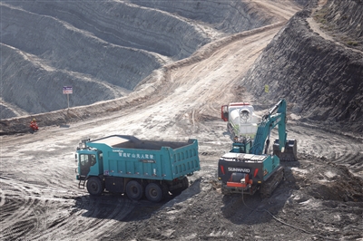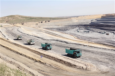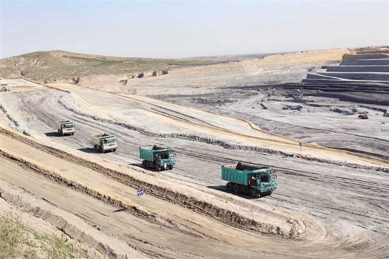 记者注意到,偌大的采场井然有序,管理人员和职工各司其职,重卡往来穿梭,高效运转,彰显出煤矿的高能高效。