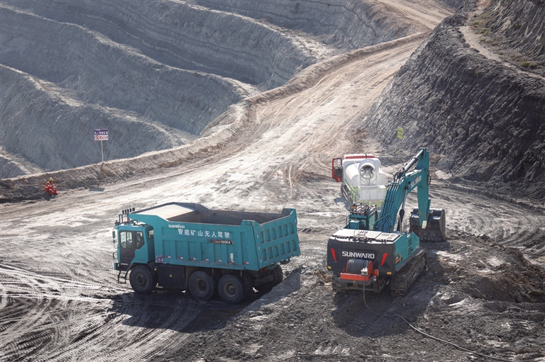 “整个矿区安装了智能鹰眼系统,利用5G低延时技术我们可以实时看到全矿的任何角落。我们在每辆重卡上安装了4个摄像头,能实时监控驾驶员行为,在车与车之间还安装了防碰撞系统。”说起智能化管理,张衡滔滔不绝。在国外几年的工作经历,使他对新生事物都有浓厚的兴趣,“智能矿山建设,我们百分之九十已经成型了,今后还要加大投入,逐步完善。”张衡说。